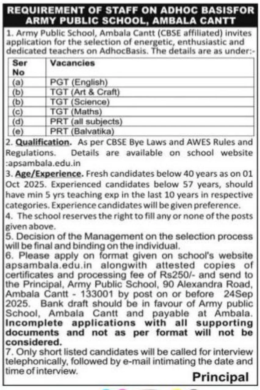 Brief Information: APS Ambala Teacher Vacancy 2025. The Army Public School, Ambala has invited offline applications for the PRT, TGT, PGT Teaching Staff Posts. Interested Candidates can fill out the Offline form. For More Jobs Like Haryana’s Latest Job 2025, Delhi’s latest Government Job 2025, and Haryana Kaushal Rojgar Nigam Vacancy 2025, please visit AfreeJobAlert.com regularly. The details of the APS Ambala Teacher Vacancy 2025, including the application form, age limit, qualification, and other relevant information, are provided below.