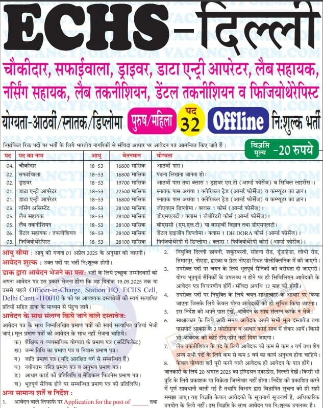 Brief Information: ECHS Delhi Vacancy 2025. The Ex-Servicemen Contributory Health Scheme Delhi has invited offline applications for the various 32 posts. Interested Candidates can fill out the Offline form. For More Jobs Like Haryana’s Latest Job 2025, Delhi’s latest Government Job 2025, and Haryana Kaushal Rojgar Nigam Vacancy 2025, please visit AfreeJobAlert.com regularly. The details of the ECHS Delhi Vacancy 2025, including the application form, age limit, qualification, and other relevant information, are provided below.