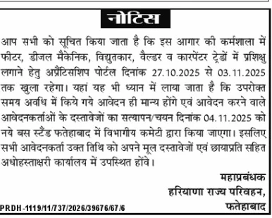 Brief Information: Fatehabad Roadways Apprentice Vacancy 2025. General Manager Haryana Roadways, Fatehabad has invited online applications for the ITI Trade Apprentice Posts. Interested Candidates can fill out the Online form. For More Jobs Like Haryana’s Latest Job 2025, Delhi’s latest Government Job 2025, and Haryana Kaushal Rojgar Nigam Vacancy 2025, please visit AfreeJobAlert.com regularly. The details of the Fatehabad Roadways Apprentice Vacancy 2025, including the application form, age limit, qualification, and other relevant information, are provided below.
