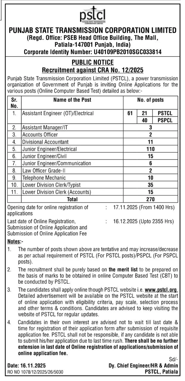 Brief Information: Punjab PSTCL Vacancy 2025. The Punjab State Transmission Corporation Limited (PSTCL) has invited online applications for the 270 Various posts on a regular recruitment basis Online Form For All India Candidates. Interested Candidates can fill out the Online form. For More Jobs Like Haryana’s Latest Job 2025, Delhi’s latest Government Job 2025, and Haryana Kaushal Rojgar Nigam Vacancy 2025, please visit AfreeJobAlert.com regularly. The details of the Punjab PSTCL Vacancy 2025, including the application form, age limit, qualification, and other relevant information, are provided below.
